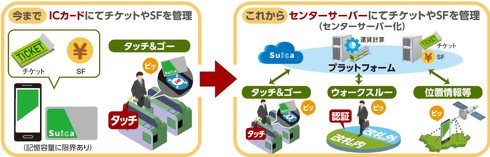 28年度には、「Suicaアプリ(仮称)」を新しくリリースし、センターサーバで管理する鉄道チケットの提供を始める。例えば、毎月3000円を払うと、自宅の最寄り駅など特定の駅を起点に、どの駅に行っても運賃が50%割引になるようなサブスクリプション商品などを販売するという。