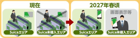 処理のセンターサーバ化により、ウォークスルー改札や、改札機がない駅での「位置情報を活用した改札」の実現も目指す。2027年春ごろには、長野を含む首都圏、仙台、新潟、盛岡、青森、秋田のSuicaエリアを統合。従来できなかったエリアを跨ぐSuica利用を可能にする他、Suica未導入のエリアでも、モバイルSuicaアプリで購入できる「スマホ定期券(仮称)」が使えるようにする。