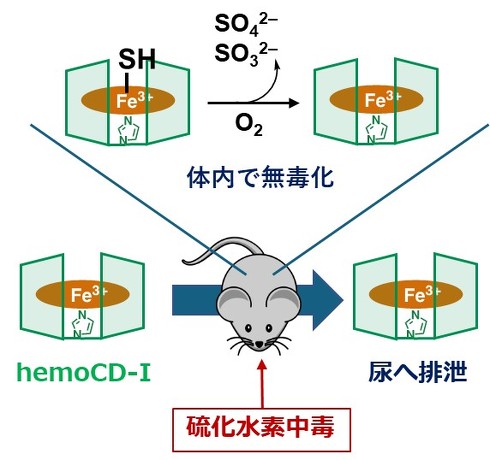 研究チームは2023年、一酸化炭素とシアン中毒の同時解毒剤である「hemoCD-Twins」を開発していた。その構成成分である「hemoCD-I」について検証を進めたところ、硫化水素と反応したhemoCD-Iは空気中の酸素と反応することで、有毒な硫化水素から無毒な硫酸イオン、もしくは亜硫酸イオンへと効率よく変換することを見つけた。