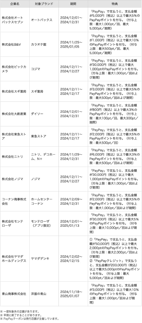 他にもスーパー、ホームセンターなど12社14チェーンが参加する。還元率は3〜5%の場合が多いが、洋服の青山は支払金額3000円以上で最大10%のPayPayポイントを付与する(最大1000ポイント/回および期間)。