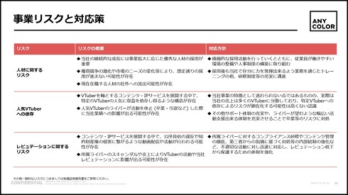 ANYCOLORは、VTuber卒業リスクについて「当社事業の特徴として逃れられない点ではあるものの、実際は当社の売上は多くのVTuberに分散しており、特定VTuberへの依存によるリスクが顕在化する可能性は高くない認識」と説明。その上で「その他サポート体制の充実や、ライバーが望むような幅広い活動支援できる体制を充実させることで卒業などのリスクに対処する」と、おおむねカバーと同様の対応方法を述べている。