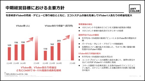 しかし、その中期経営方針はカバーとは異なるようだ。ANYCOLORは「引き続きVTuberの育成・デビューに取り組むとともに、エコシステムの強化を通してVTuber1人当たりの収益を拡大」と方針を打ち出している。