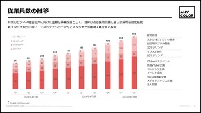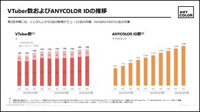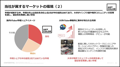 ANYCOLORはVTuber市場について「市場の売上は当社を含む上位2社が半分超を占めており、大手がインフラ面や既存コミュニティーの活用を通し、優位性を発揮し易い状況」と説明。既存コミュニティーを活用することで新人VTuberの垂直的な立ち上げや、複数人の同時育成・デビューが可能であるとしている。