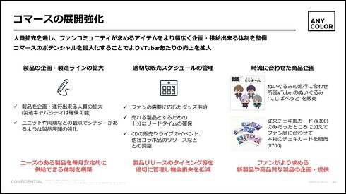 このような状況を踏まえ、コマース領域の企画を充実化して各VTuberのファンコミュニティーを拡大するとともに、マネジメントや企画担当のビジネス領域の従業員を増員。所属VTuberのスケジュール管理によって、機会損失を回避して販売機会を拡大する方針を示した。
