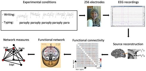 この研究では、36人の大学生を対象に、デジタルペンによる手書きとキーボードによる文字入力時の脳活動を、256個の電極を備えた高密度脳波計(EEG)で詳細に測定・分析した。