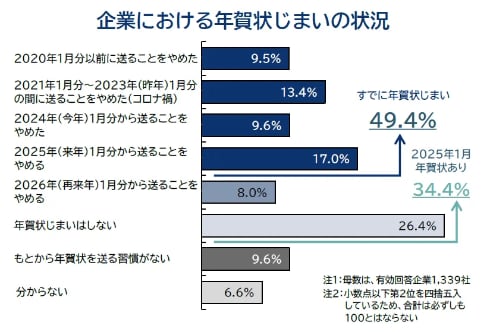 帝国データバンクは12月13日、国内1300社あまりの企業を対象とした「年賀状じまい」に関する調査結果を発表した。既に年賀状じまいをした企業は49.4%と半数を占めた。