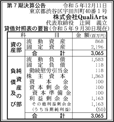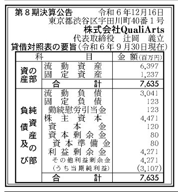 サイバーエージェントの子会社で、ゲーム開発などを手掛けるQualiArts(東京都渋谷区)の第8期決算公告(2023年10月1日〜2024年9月30日)が12月16日付の官報で明らかになった。純利益は31億700万円となり、前年の5000万円から前年比6214%の大幅成長となった。純資産も76億3500万円(前年30億6500万円)で、前年比249.1%だった。
