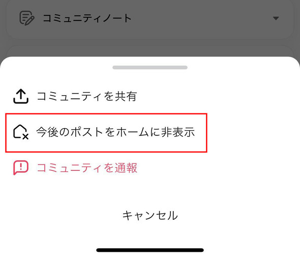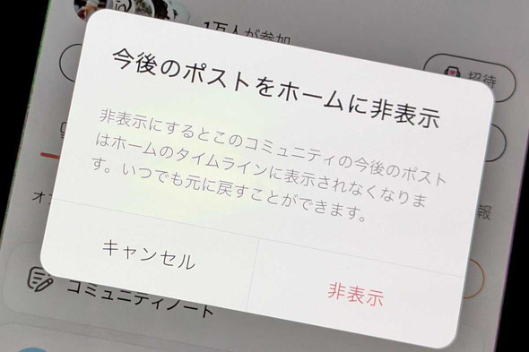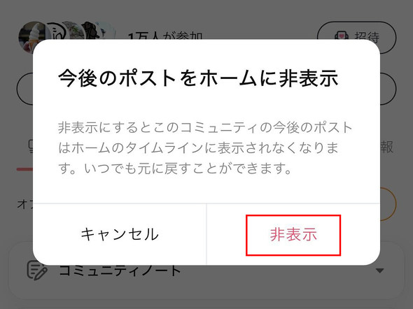 設定は、該当コミュニティのトップページから設定メニューに入り、「今後のポストをホームに非表示」というボタンをタップすると、それ以降にポストされた投稿がホームに表示されなくなる。一方、ホームで非表示にした場合でも、コミュニティの投稿についてはコミュニティタブから引き続き閲覧することができる。