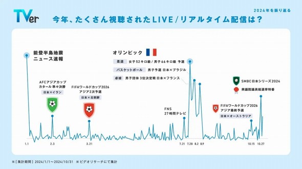 TVerは、テレビ番組の見逃し配信サービスという立ち位置だが、今年大躍進した理由の1つは、ライブ配信の充実だろう。スポーツライブでネット配信サービスが足場を固めた例としては、2022年の「FIFAワールドカップ カタール 2022」において、ABEMAが全試合無料中継したことが記憶に新しい。