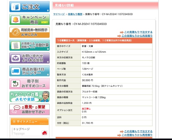 筆者が「菊月千種の夕暎」という本を文庫で作るために、「ちょ古っ都製本工房」さんで取った見積りの例。100冊を10日営業日コースの発注で作ると。諸経費込みで3万1790円。つまり1冊あたり約318円で作ることができる。KDPだと日数による割引などはないが、印刷屋さんだと、どこも入稿から納品まで長いほど安くなるまた、KDPのように、1冊から安価で作ることができるサービスは、1冊作っても100冊作っても1冊あたりのコストは変わらない。なので、文学フリマ用に2〜30冊作って、売り切ってしまおうというような場合はいいのだけど、100冊、200冊作るとなると、印刷屋さんのサービスの方が安上がりだったりする。ただし、その場合、200冊分とかを前払いすることになるので、初期コストはそれなりにかかる。