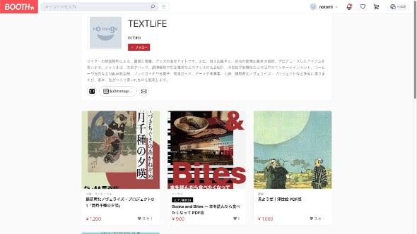 筆者が、自主出版した本や、そのPDFファイルを販売しているBOOTHのサイト。簡単に自分のショップを持てるのは、本を売りたい個人にとって、とても助かるし、もしイベントで売れなくても、他で売る機会があると思えることで、本を作りやすくなるさらに、文学フリマ前後に、自分の本を売るためのサービスが充実してきたのも、本を作るというハードルをかなり下げている。筆者も、DMによる直販以外に「BOOTH」と「BASE」の通販サービスを利用している。特に、PDFファイルを販売できるBOOTHは、自主出版をするものにとって、とてもありがたい。
