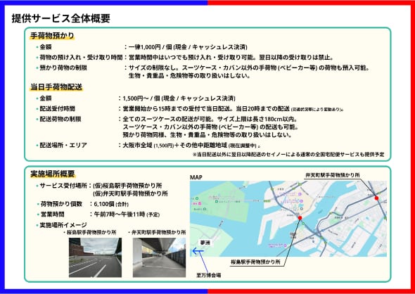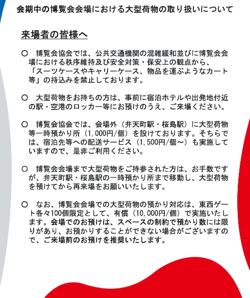 博覧会協会は「会場まで大型荷物を持参してしまうと、弁天町駅や桜島駅に設ける『大型荷物等一時預かり所』まで移動し、大型荷物を預けてから再来場となるケースもある」としている。