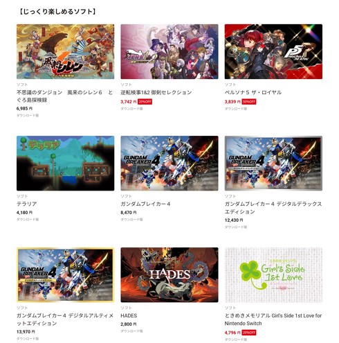 例えば「ゼルダの伝説 ティアーズ オブ ザ キングダム」は定価7990円のところ、30%オフの5530円で販売する。「パワフルプロ野球2024-2025」は定価8470円の20%オフで6776円、「カービィのグルメフェス」は定価1500円の30%オフで1050円、「ペルソナ5 ザ・ロイヤル」は定価7678円の50%オフで3839円などの割引となる。