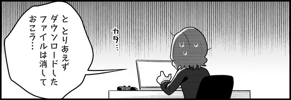 前職からの連絡の内容は「在籍中のパソコンのログに不審な形跡がみられました」という内容。不安に思ったルカワくんは、前話でダウンロードしたファイルを消しますが……。