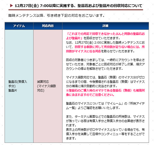 運営チームは27日、FGO内でガチャを回すために使うアイテム「聖晶石」(無償入手分)と「聖晶片」(無償で入手でき、一定数で聖晶石に交換できるアイテム)の減算対応を発表。「これまでの対応で回収できなかった分と同数の聖晶石と聖晶片を回収する」と報告した。その際、回収する数よりも所持数が少ない場合には所持数がマイナスになるという。所持数がマイナスになったプレイヤーは、今後獲得する聖晶石(無償)がマイナス分の補填に自動的に充てられるという。