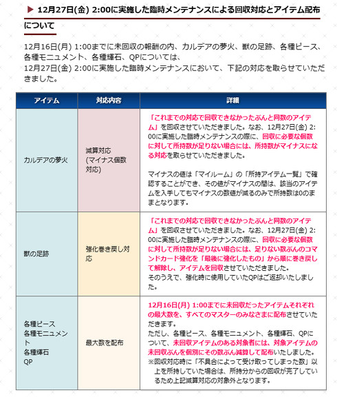 聖晶石の回収は27日以降午前7時以降に実施予定で、その他のアイテムへの対応はすでに実施済み。対象アイテムのうち、貴重なアイテムである「カルデアの夢火」「獣の足跡」については減算や巻き戻しの対応となるほか、日常的に獲得可能なアイテムについてはバグによって取得可能だった最大数を全ユーザーへ配布する対応とした。