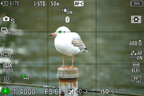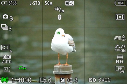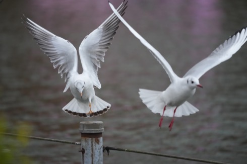 ソニーが得意とするリアルタイムトラッキングも優秀でよい。こちらは杭に向かって飛んできたユリカモメ(後ろにいる方)をリアルタイムトラッキングで追いながら連写した中の1枚。手前は杭から追い出されたユリカモメ。