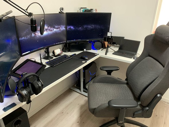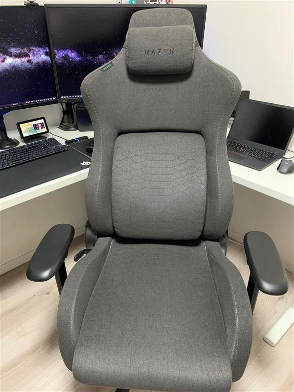 親会社のソフトバンク向けのアカウント営業を担当しています。テレワークが本格化してからは対面でのミーティングの頻度が減り、オンラインとなったため、ワークチェアに少しこだわりました。ゲーミングガジェットが大好きで高身長のため、適性身長180〜208cmの「Razer Iskur Fabric XL」を選定しました。