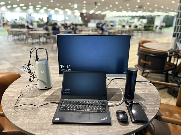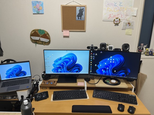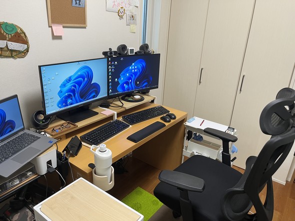 自社業務を行う場合には、HDMI分配器を用いて、左側のモニターで顧客環境のSlackを映しておき、右側のモニターで事務処理や資料作成を行っています。