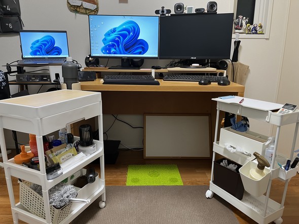 業務終了後はプライベートでモニターを利用するため、100均の板材の上にキーボードを載せ収納しやすくしています。イスの両隣の棚にはティッシュやクリームなどを配置し、手を伸ばせば全てに届くようにしています。