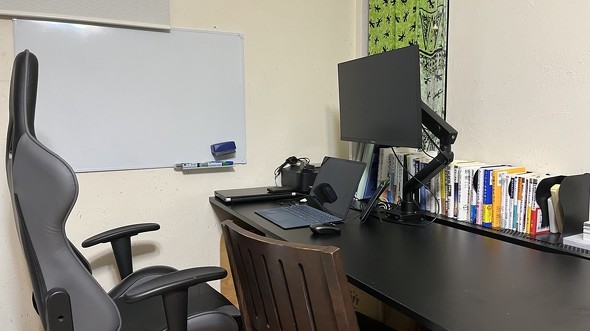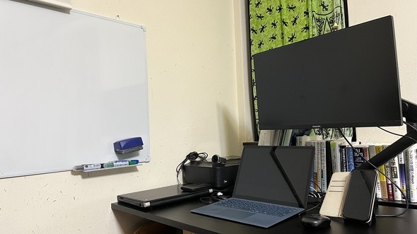 新規事業開発を担当しています。長く学生時代に購入した椅子・机を利用していましたが、在宅勤務でも疲れにくく、書籍も手に取りやすく横を向けばホワイトボードで“一人ブレインストーミング”ができる在宅環境を目指して、刷新しました。