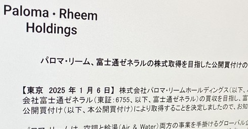 ガス機器大手パロマの持ち株会社であるパロマ・リームホールディングスは1月6日、富士通傘下の電気メーカー・富士通ゼネラルに対し、買収を目的とした株式の公開買い付け(TOB)を実施すると発表した。1株2808円で買い付け、総額1646億7448万8888円になるという。7月にTOBを実施し、最終的に完全子会社とする予定。