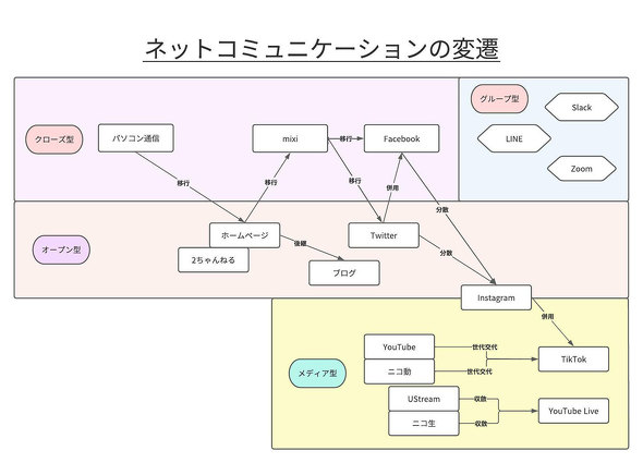 もう20年前に始まったサービスなので、下手すれば35歳以下の方は使ったことも、名前を聞いたこともないかもしれない。参考までに前回掲載した「ネットコミュニケーションの変遷」の図を再掲しておく。