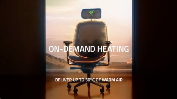 メッシュ素材のゲーミングチェア「Razer Fujin Pro」をベースに、ファンとPTC(Positive Temperature Coefficient)ヒーターを内蔵した。ファンは背面下部にあり、下から空気を吸い上げて椅子のフレームから吹き出す仕組みだ。