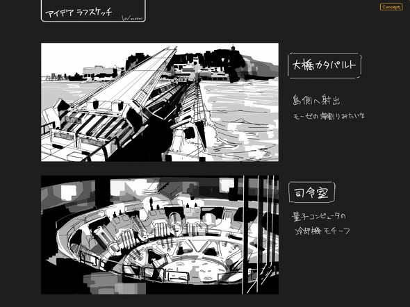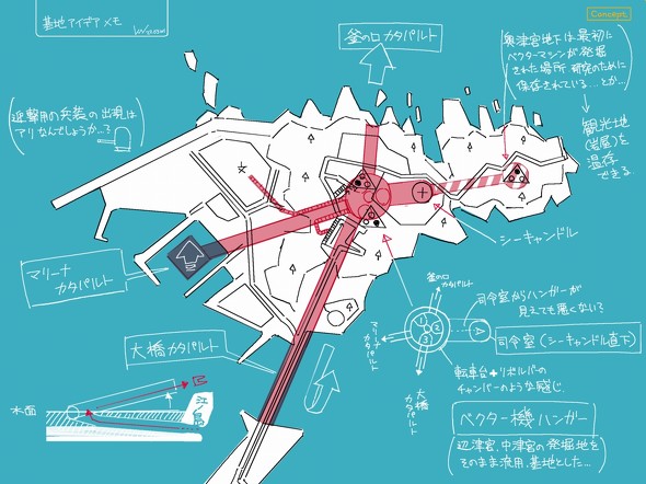 糸曽:江の島は、実際に訪れてみると分かりますが、見る角度や場所によって全く異なる表情を見せる場所です。例えば、第二次世界大戦末期には、旧日本軍によって要塞化されていたという歴史があります。戦闘機に詳しい方から聞いた話ですが、江の島につながる橋(江の島大橋)は、戦闘機の滑走路として利用できるほどの長さがあるそうです。こうした地理的な特徴を生かし、今回は、ベクターマシンが発進する基地を江の島に設置するという設定にしました。