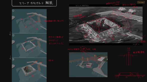 さらに、今回登場するベクターマシンは、これまでのアクエリオンシリーズに登場したマシンよりもサイズが小さく設計されています(※従来のアクエリオンの全高は約50m)。これは、3機のベクターマシンが、江の島に設置された3つのカタパルトから同時に発進するシーンを、よりリアルに描写するためです。このように、江の島の地形や歴史をメカ設定やアクションシーンに反映させています。