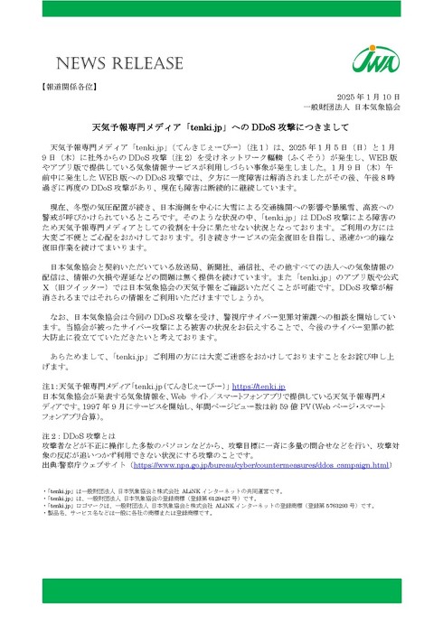 tenki.jpを巡っては、5日にDDos攻撃を受け、Web版・アプリ版に一時つながりにくい状況が発生していた。その後、9日午前7時ごろから再度DDos攻撃を受け、tenki.jpのWeb版で同様の障害が発生。同日午後4時30分ごろに復旧したとしていた。