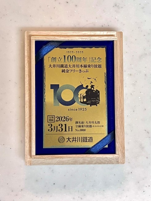 100万円の切符は、大井川鐵道の創立100周年企画第1弾として販売するもの。他にも、200枚限定の記念コインや記念腕時計、名刺としても利用できる乗車券セットなどを展開する。