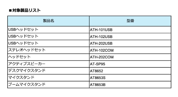 イヤフォン型USBヘッドセット「ATH-202USB」、アクティブスピーカー「AT-SP95」など9製品が対象。平均で約22%値上げするとしている。