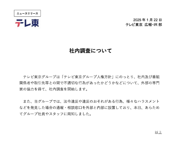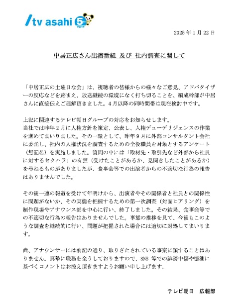 日本テレビやテレビ朝日、テレビ東京などが社内調査を実施すると発表した件については、各社の自主的な対応に任せる方針を示した。現段階で民放連として調査などを行う予定はないという。