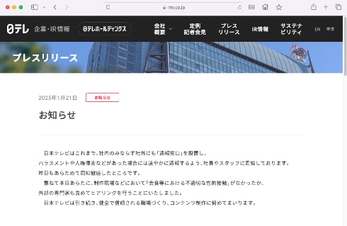 フジテレビは、タレントの中居正広さんの女性トラブルに同局社員が関与したという報道を受け17日に記者会見を行ったが、一部メディアに限定するなど閉鎖的だったと各所で指摘されている。その後、多数のスポンサー企業がCMを差し止める事態に発展した。