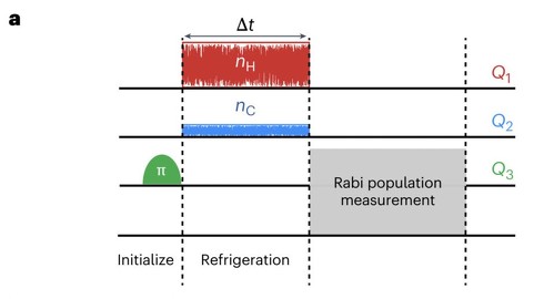 この装置の仕組みは、3つの量子系の相互作用を利用している。まず、目的の量子ビットと2つの補助的な量子系(キュディットと呼ばれる多準位の量子系)を用意する。そして2つの補助系をそれぞれ異なる温度の熱浴(温かい場所と冷たい場所)に接続する。この温度差をエネルギーの源として利用し、3つの量子系の相互作用を通じて、目的の量子ビットから熱を効率的に取り除くことで、より低温な状態を実現できる。