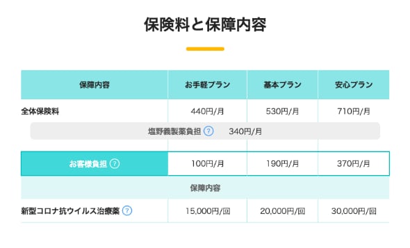 保険を塩野義製薬が協賛。保険料の一部を負担するため、本来は月額440円の「お手軽プラン」を月額100円で提供する。この場合のお見舞い金は、1回あたり1万5000円。月額370円(本来は710円)の「安心プラン」なら1回3万円となる。