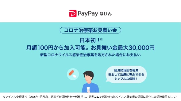 PayPay保険サービスなど4社は1月28日、新型コロナウィルス感染症と診断され、治療で指定の抗ウイルス薬が使われた場合に「お見舞い金」(保険金)を出す新商品「コロナ治療薬お見舞い金」の販売を始めた。保険期間は2月11日から。