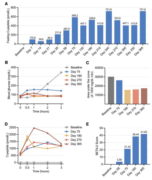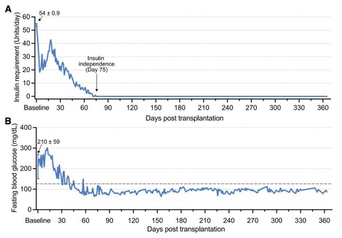 移植の結果は極めて有望なものであった。移植から75日後、患者は注射によるインスリン投与から完全に離脱できた。血糖値の管理状態を示す指標として、正常範囲(70〜180 mg/dL)内に収まる時間の割合は、移植前の43%から4カ月後には96%以上に改善し、その後も98%以上の良好な状態を維持した。また、過去2〜3カ月の平均血糖値を反映するHbA1c値も正常範囲(約5%)まで低下した。