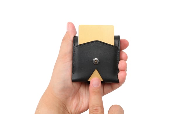 名刺は入れないと決めてしまえば、あとの問題は、複数のカードから、いかにスムーズに必要なカードだけを取り出すかということに絞られる。それを、ケースから完全に取り出さずに、扇状にカードを開くというアイデアで解決しているのが、このカードケース最大のイノベーションだろう。名刺も入れるとなると、「選ぶ」に、ここまでフォーカスは当たらない。