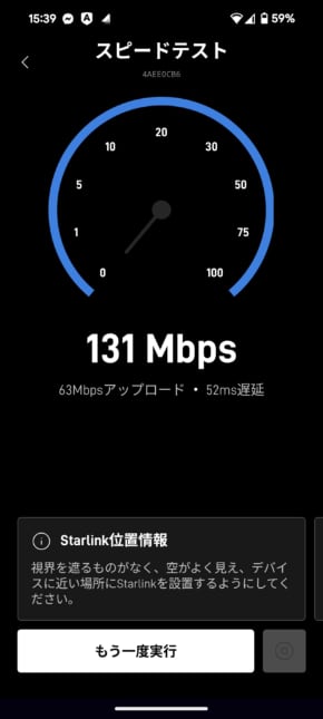 スピードテストを行ったところ、上り63Mbps/下り131Mbpsと光回線並みです。遅延は52msでした。