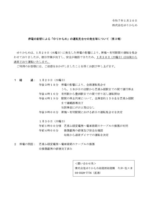 その後、30日午前1時ごろに芝浦ふ頭変電所と電車線をつなぐケーブルの損傷が判明。午前4時に損傷部分の修復と安全を確認し、同日の始発から通常ダイヤで運転すると決定した。