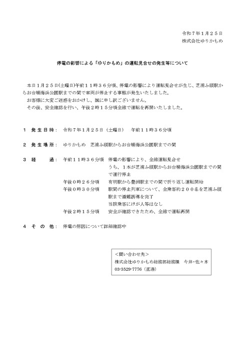 ゆりかもめでは、29日午後3時18分、停電の影響により全線運転見合わせとなり、うち1本が日の出駅〜芝浦ふ頭駅の間で停止した。午後4時台に有明駅〜豊洲駅の間で折り返し運転を再開し、駅間で停止していた列車の全乗客の避難誘導を完了。一方、新橋駅〜有明駅間は終日運転見合わせとなった。