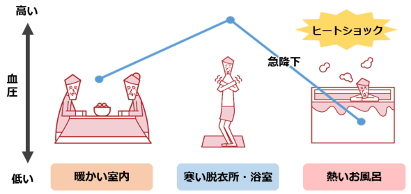 また例えば銭湯には必ず注意書きがあるように、飲酒後の入浴には健康リスクがあるとされている。これはお酒を飲むと血圧が下がるためで、この状態はヒートショックのリスクも高めてしまう。