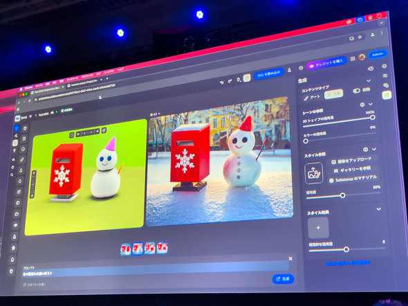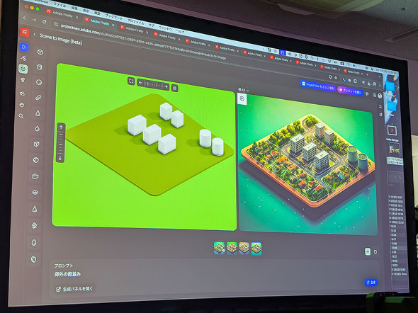 また、生成AI「Adobe Firefly」を使った「シーンから画像生成」も搭載。レイアウト中の3Dモデルから画像を生成できる機能で、Adobe MAXのデモでは、雪だるまとポストの3Dモデルを並べたレイアウトから、プロンプトを用いて冬の街中をイメージした画像を生成。長方形と円柱のブロックを並べた状態から、都市の画像を生成する様子も披露した。