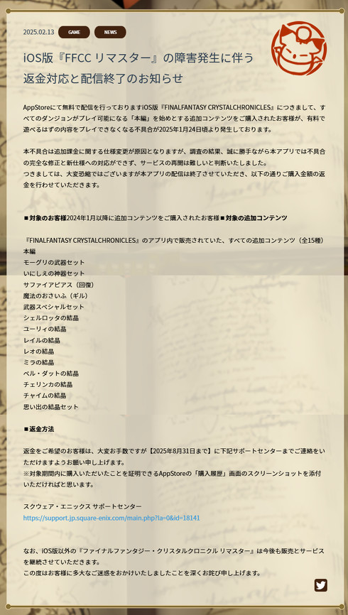 FFCCを巡っては、1月24日ごろから、有料追加コンテンツを購入したユーザーを対象に「有料で遊べるはずの内容をプレイできなくなる不具合」が発生した。原因は、追加課金に関する仕様変更であると判明。しかし調査の結果、同アプリでは不具合の完全な修正と新仕様への対応ができないと分かり「サービス再開が難しい」と判断したという。