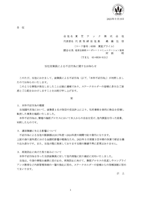 東芝テックが債権を確認中に従業員からの自白を受け、社内調査をした結果、不正行為が判明した。同社は従業員を社内規定に則して処分。再発防止に向け、業務プロセスを見直し、コンプライアンス教育を徹底するとしている。業績への影響は軽微という。