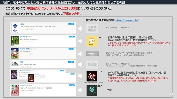 政府による検閲が行われる中国で制作される作品は、自ずと表現に制約があり、中国以外の海外市場では継続的な支持を得られていないが、多種多様な作品を生み出す基盤のある日本のセルルックアニメは、配信サービスの拡がりという後押しを受けて日本ブームを海外に巻き起こしている。労働環境や空洞化など指摘されるさまざまな課題の解決を図りながら、これらの強みを伸ばしていくことが、日本政府が掲げる「コンテンツ産業を2033年に20兆円規模へ」という目標達成にもまず必要なことだといえる。