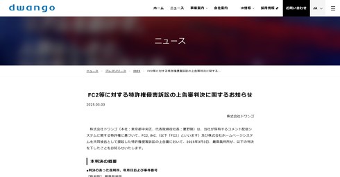 ドワンゴは3月3日、動画サイト「ニコニコ動画」に関する特許を侵害されたとして、米FC2などを訴えていた裁判について、最高裁判所が同日に特許権の侵害を認めたと発表した。判決を受け、ドワンゴは「日本の特許権の効力に関して一つの指針が示されたことは、大変意義深いこと」などとコメントしている。