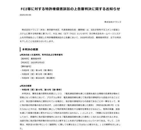 ドワンゴは、ニコニコ動画の画面上に流れるコメントの配信システムの特許権をFC2が侵害しているとして提訴。一審では、FC2のコメント配信サーバが国外にあることから、特許権は日本国内でのみ有効とする「属地主義」によって特許権侵害は否定されていた。一方、控訴審では、特許の中心的機能であるコメントの表示が日本にあるユーザー端末で発生していたことなどから、ドワンゴが逆転勝訴していた。